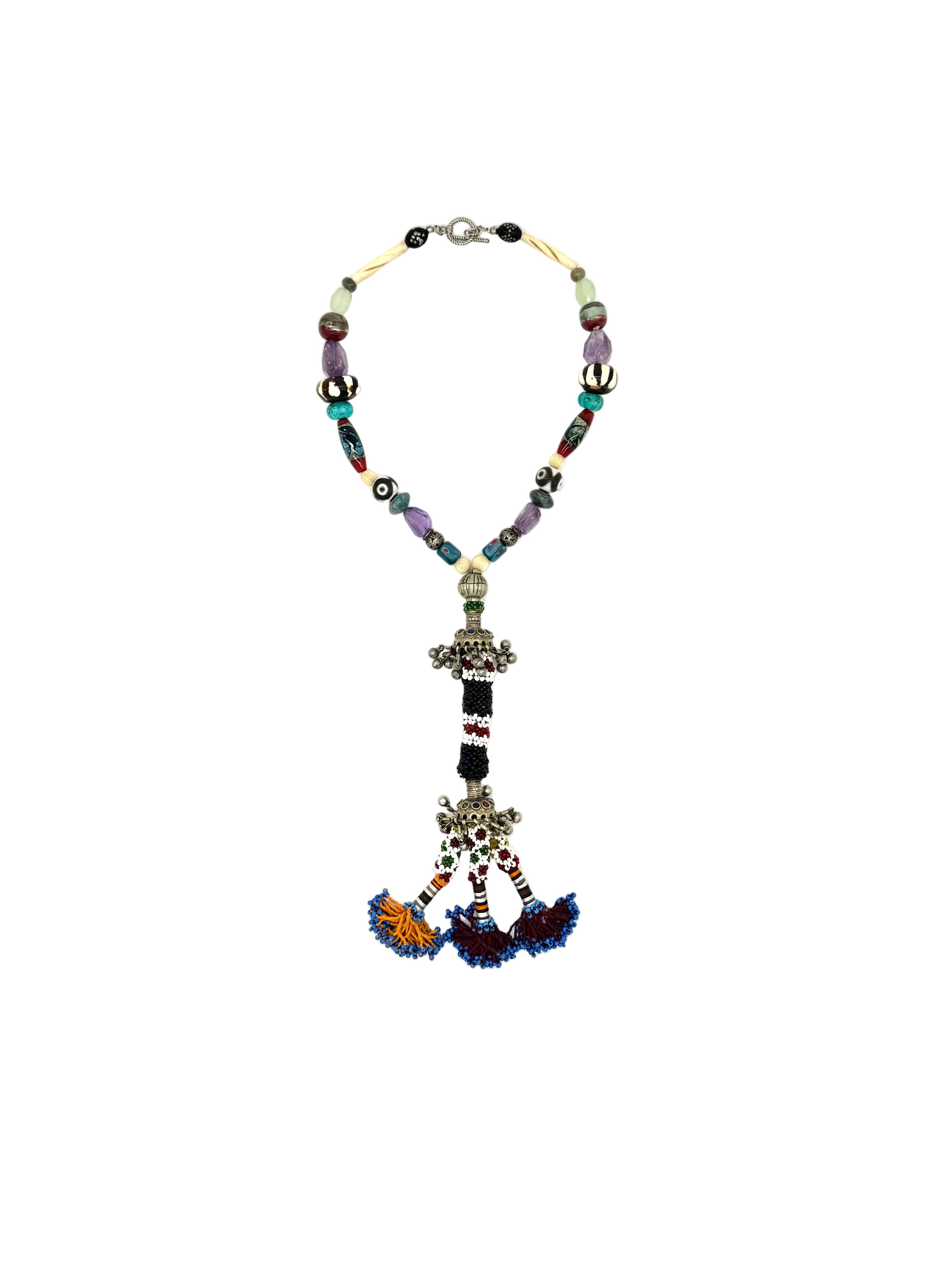 Afghani Tassel, made by Turkoman nomads, with amertrine, agate, jasper, turquoise colored African trade beads, chalcedony, and glass.