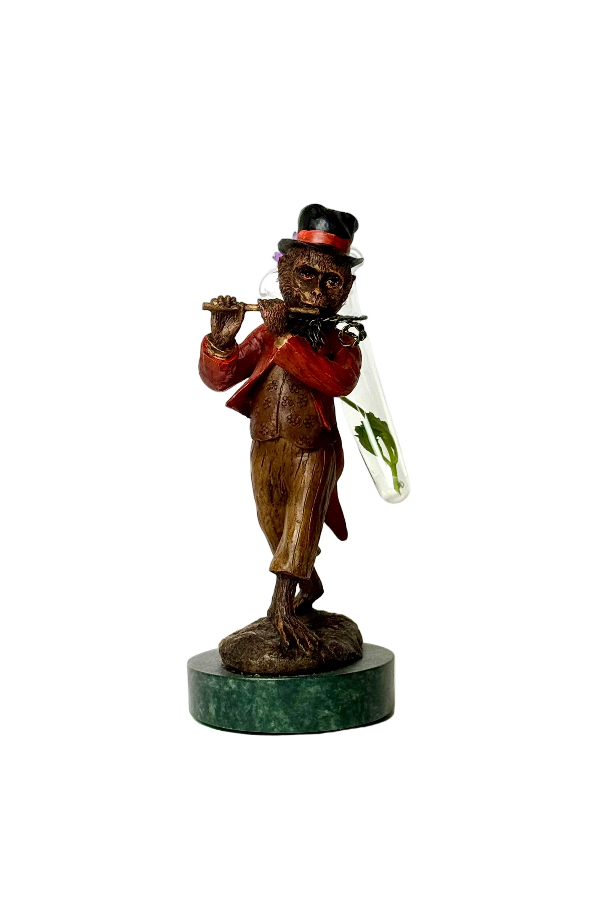 Musical Monkey Vase with Flute, handpainted cast metal with glass vase on a marble base.