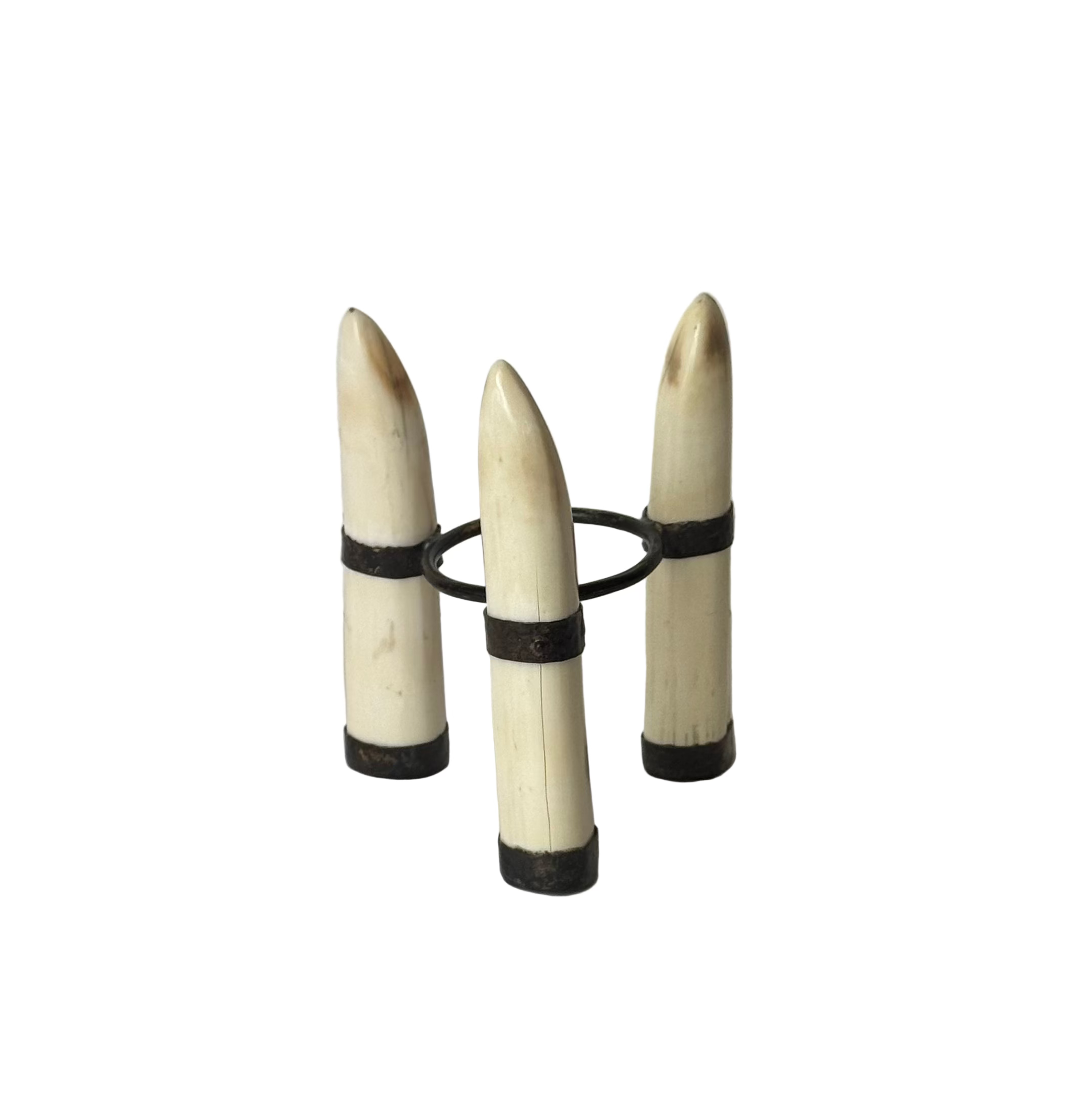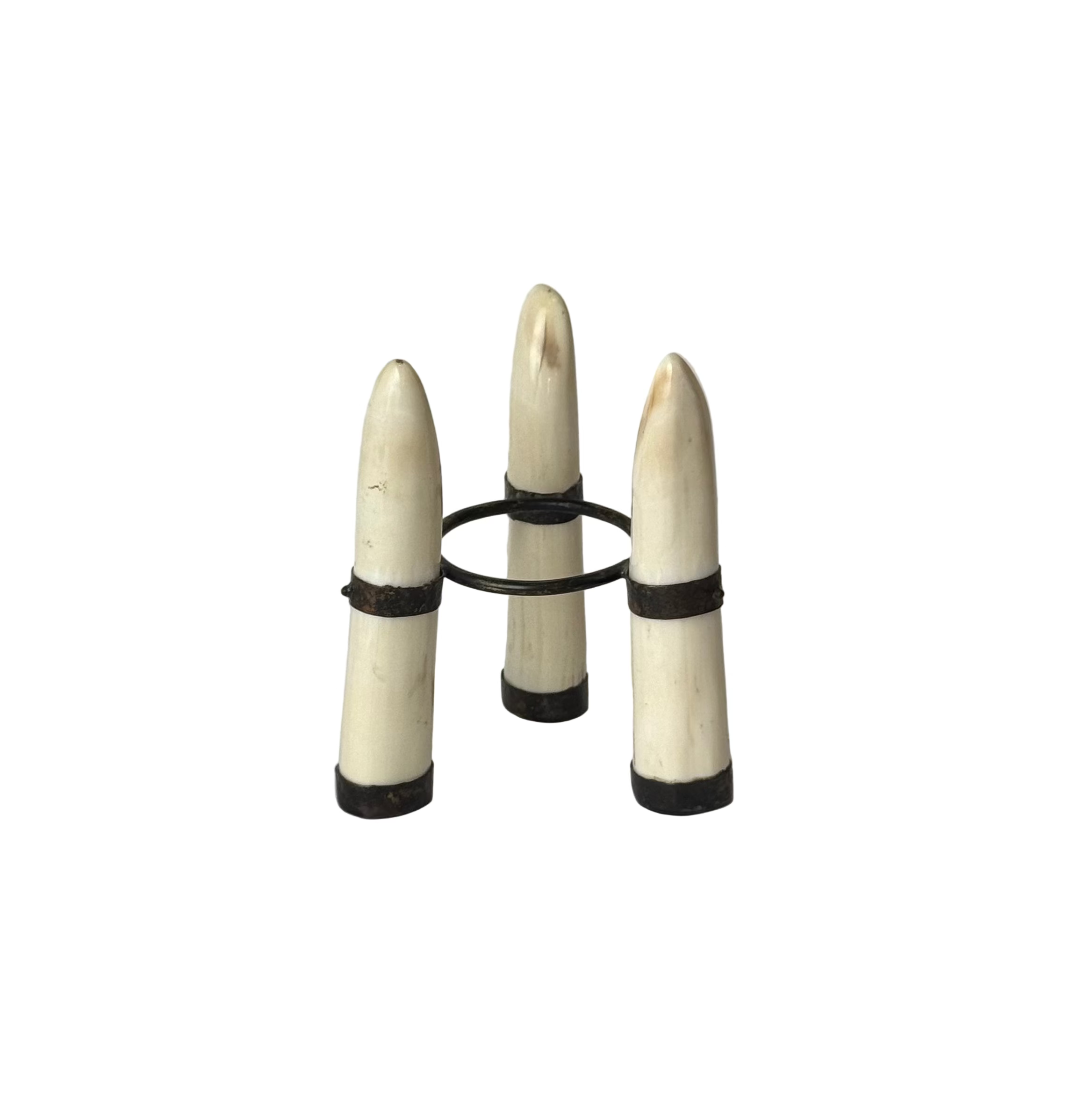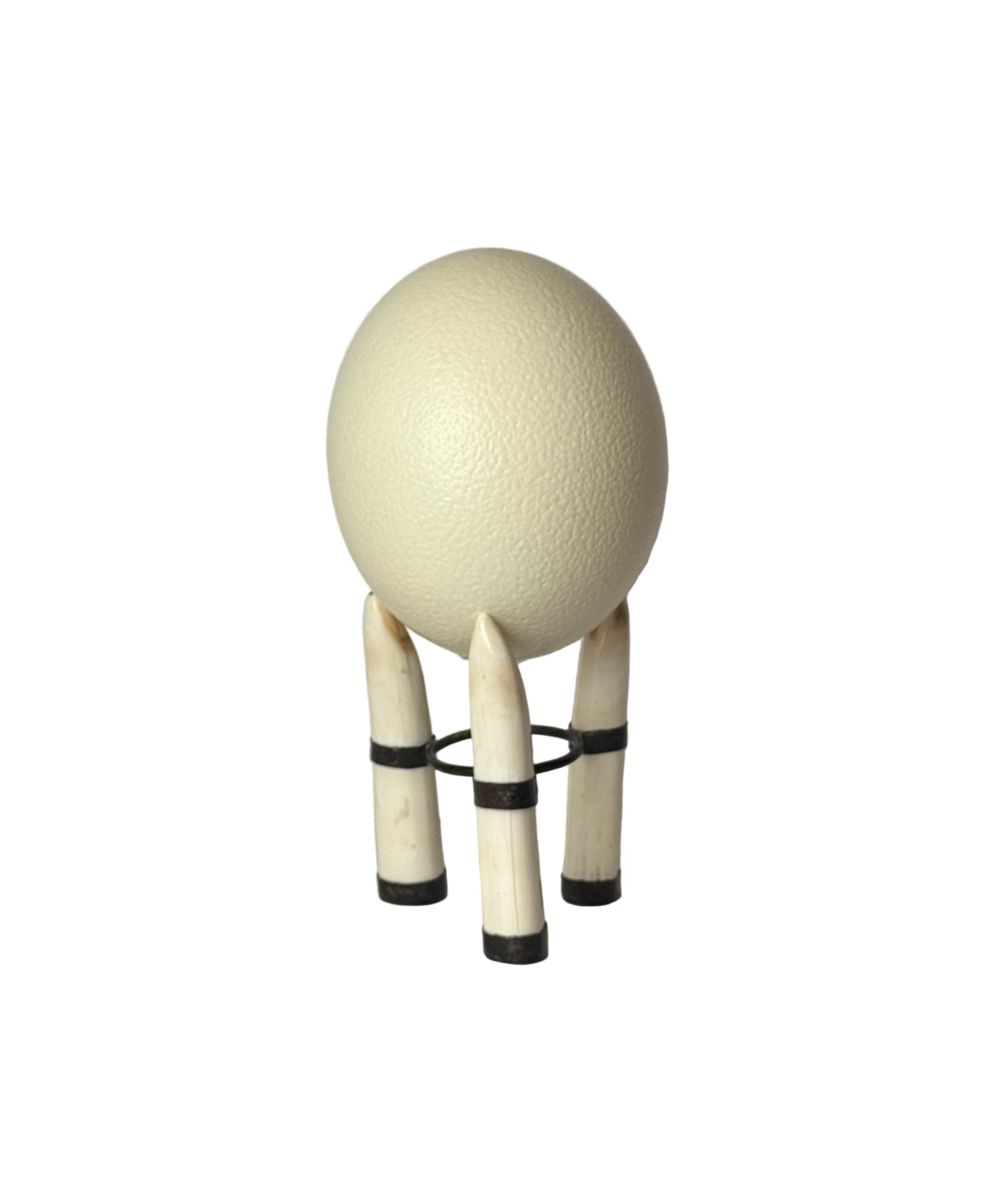 Ostrich Egg on Stand, ivory hippo teeth on tripod iron frame, sold as a set.