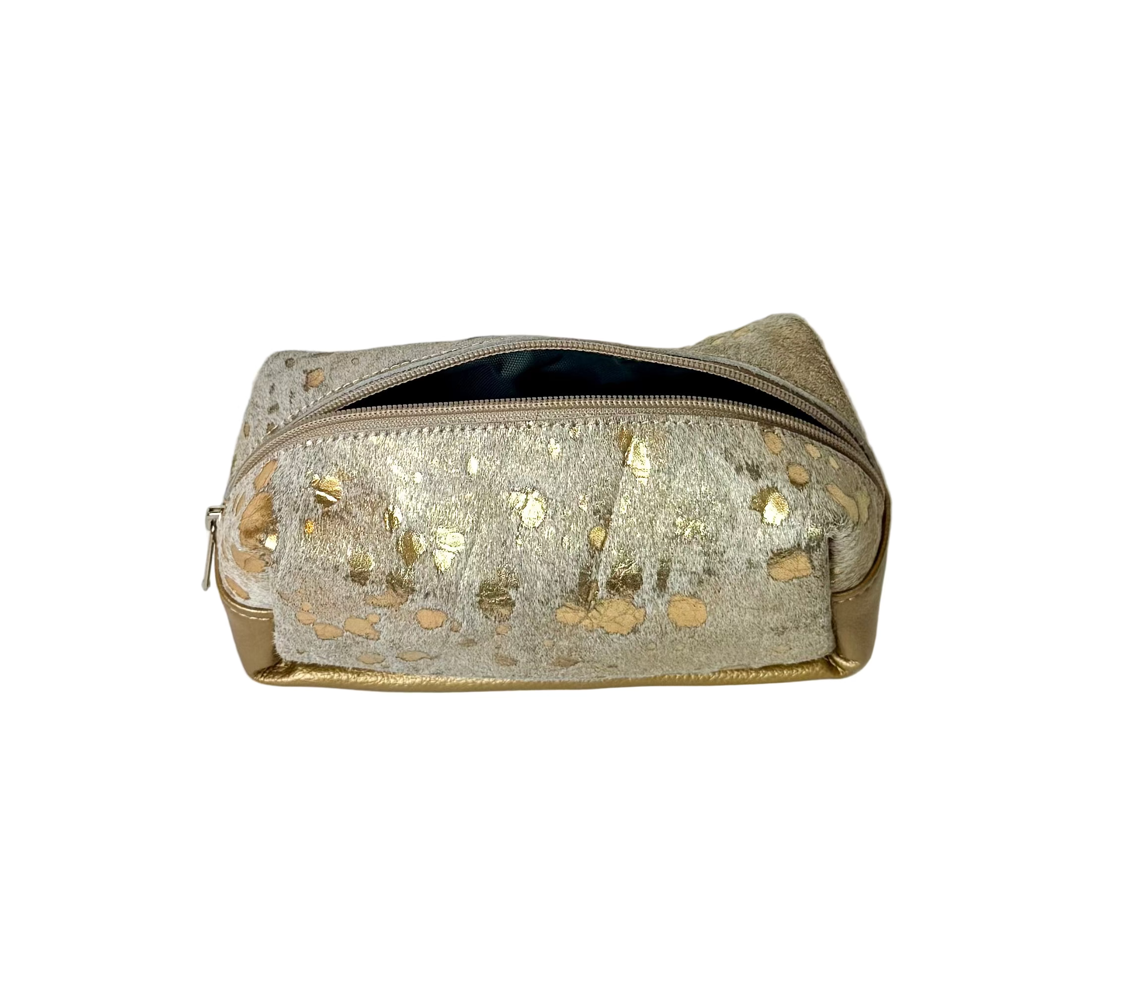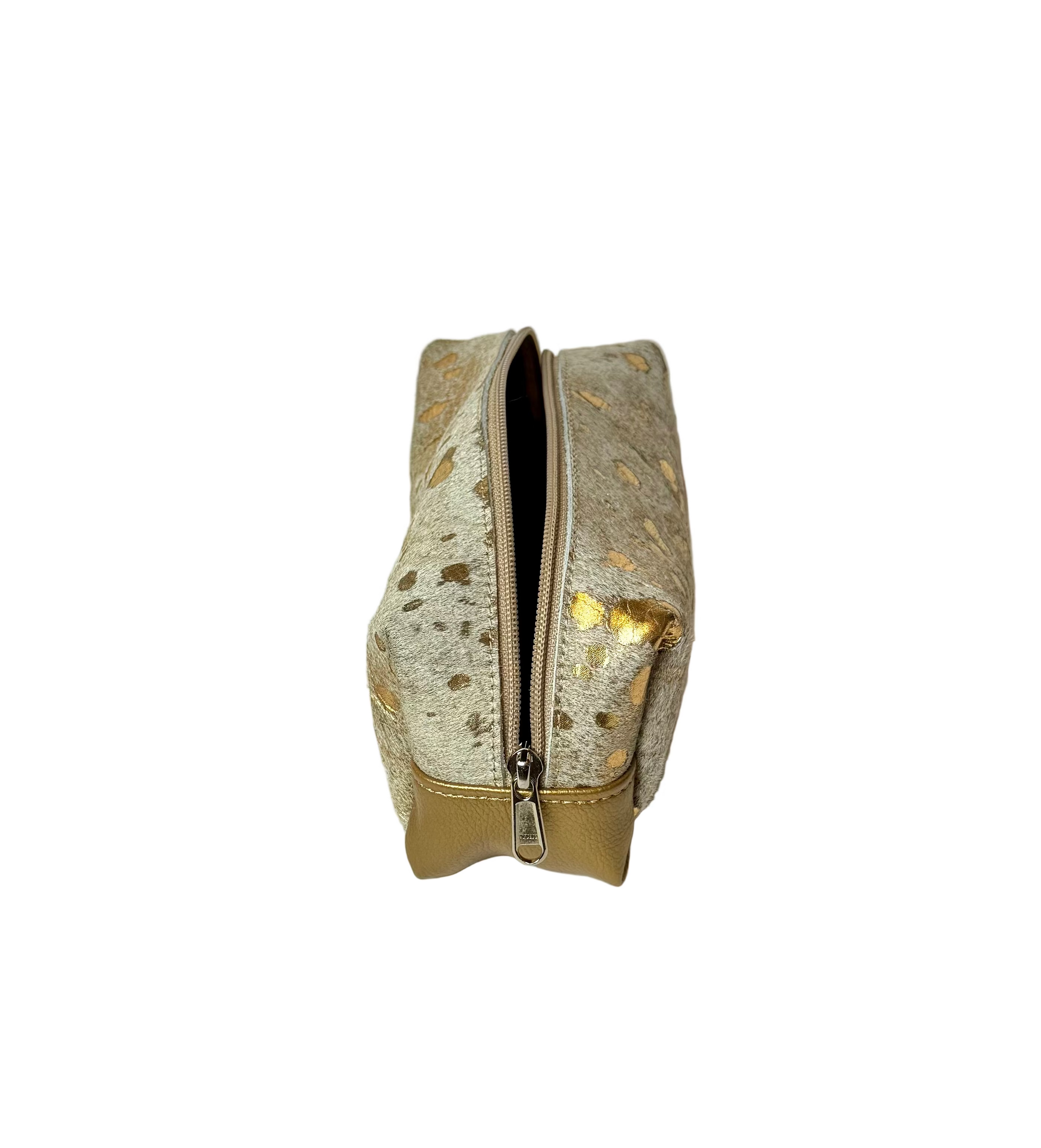 Cowhide Zipper Tote, metallic gold accents highlight natural cowhide, gold leather trim and vinyl lining made in South Africa.