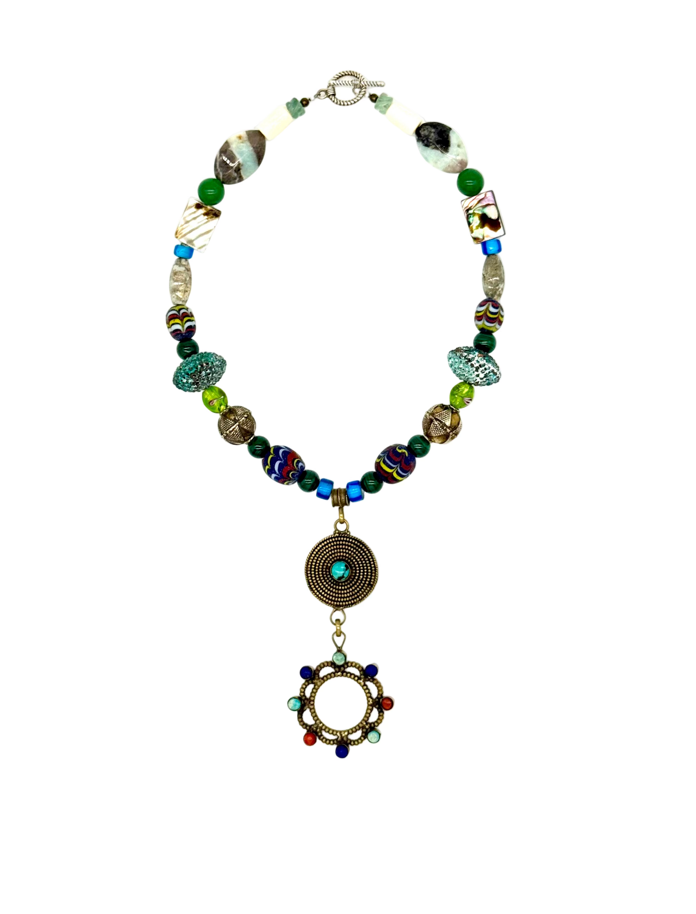 Tibetan Brass Pendant Necklace, vintage brass pendant with malachite, Thai millefiori striped beads, agate, and mother of pearl.