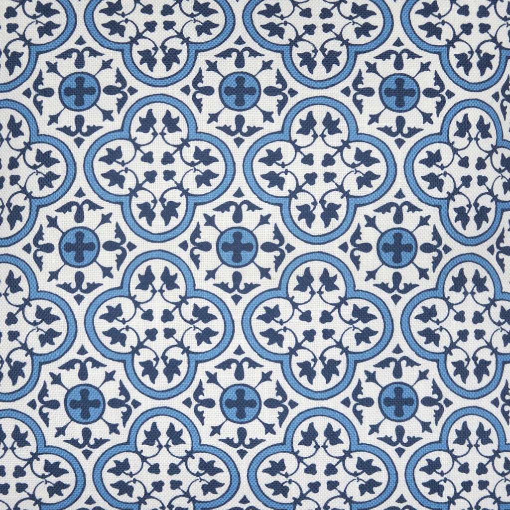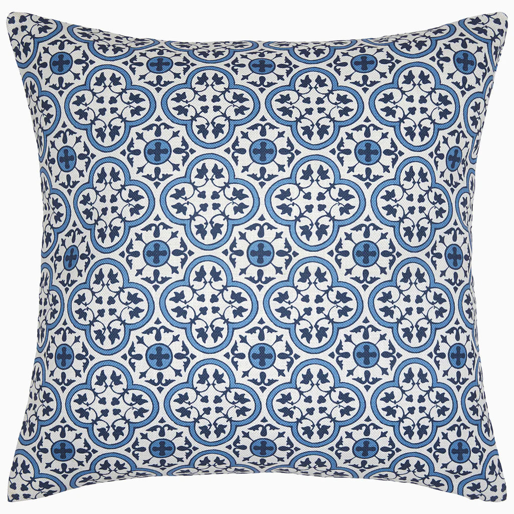 Darshan Outdoor Pillow, mixed blue pattern on white.