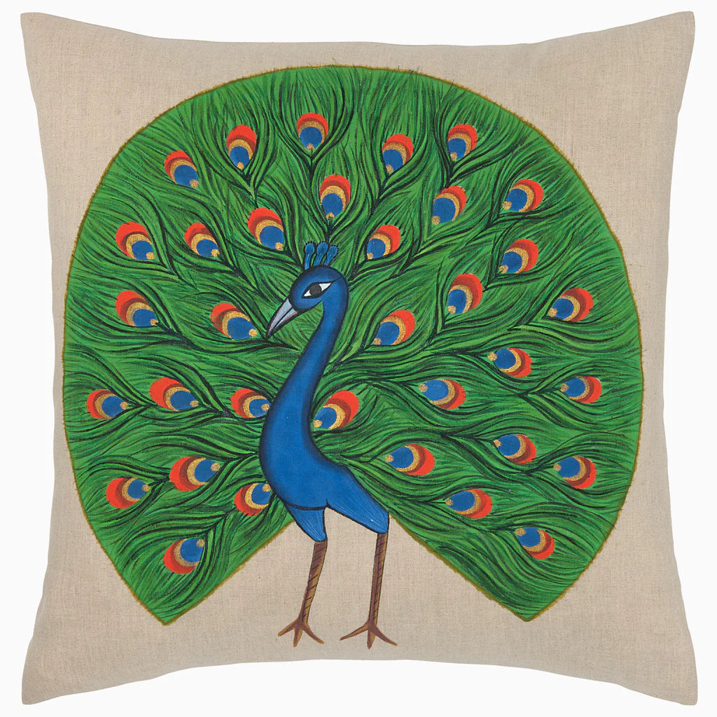 Majestic Peacock Pillow, hand painted peacock bird design on linen/cotton, solid back.