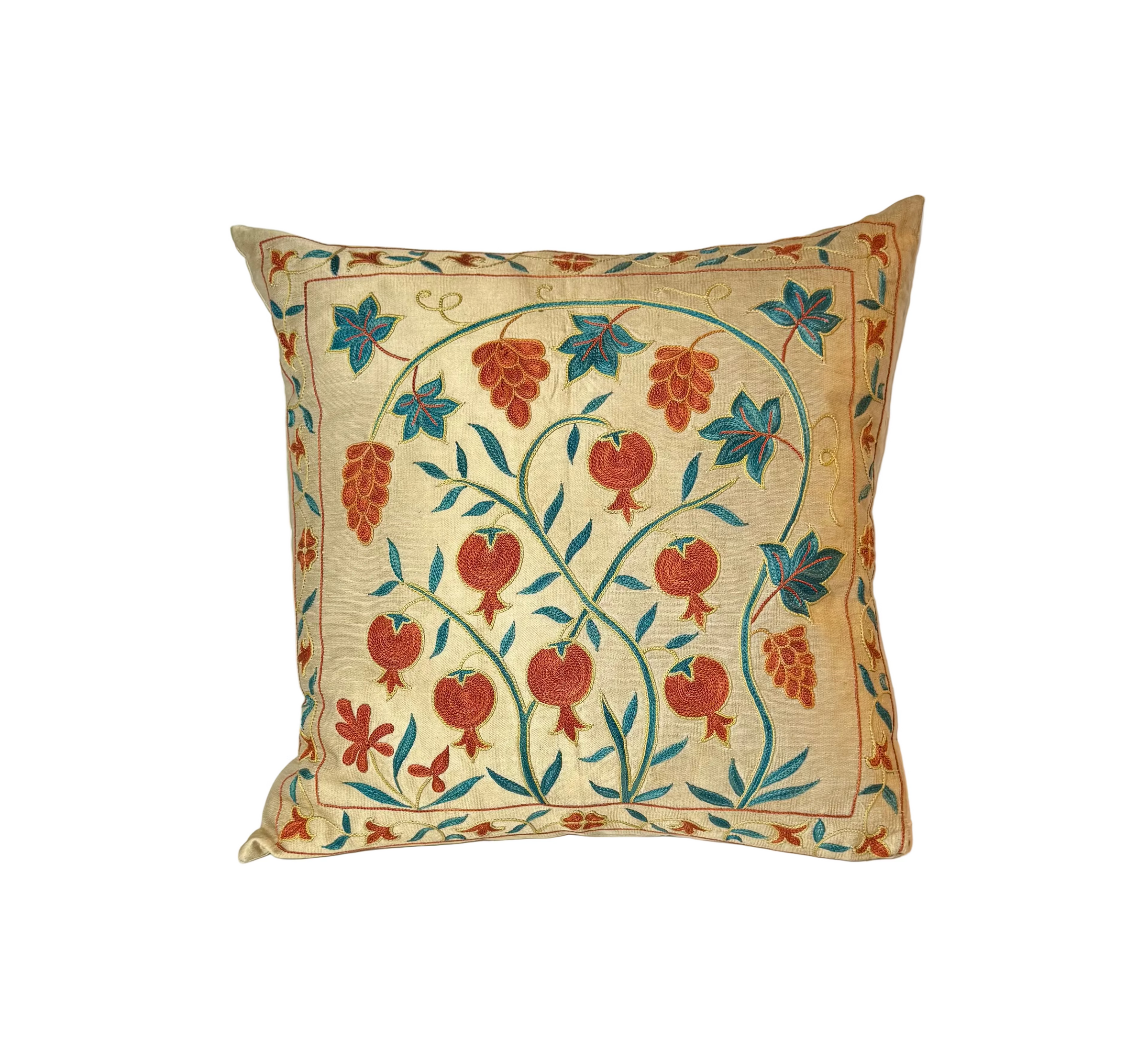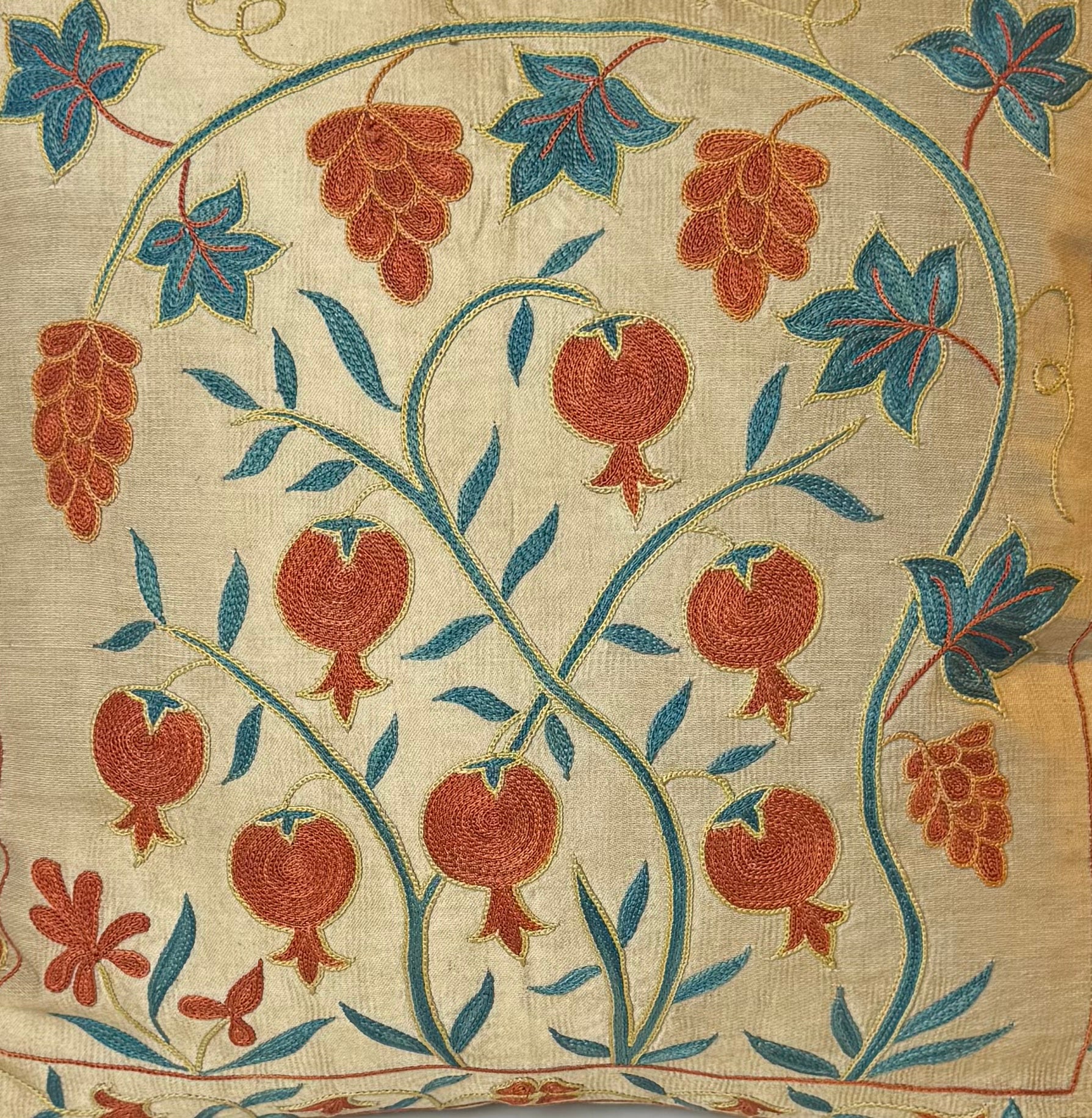 Vintage Suzani Pillow, rust and greens embroidered on golden silk.